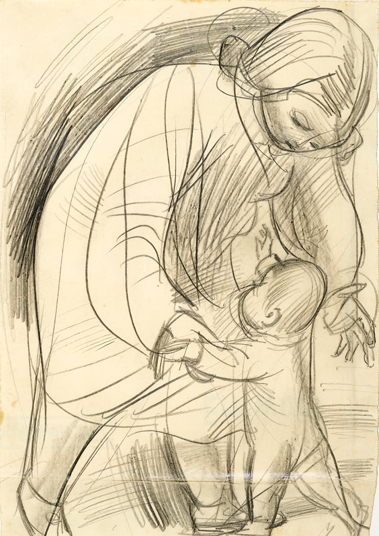 Josef Georg Miller, auf dem Bauch der Mutter, Bleistiftzeichnung, 22 x 30 cm