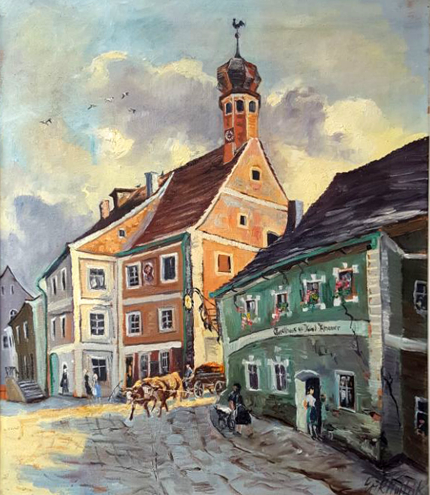 Der Marktplatz auf dem Bild von Erik Mailick ist belebt. Ein Ochsengespann kommt von der Steineren Brücke, in der Tür vom Gasthof Karl Knauer wartet eine Bedienung auf Gäste.