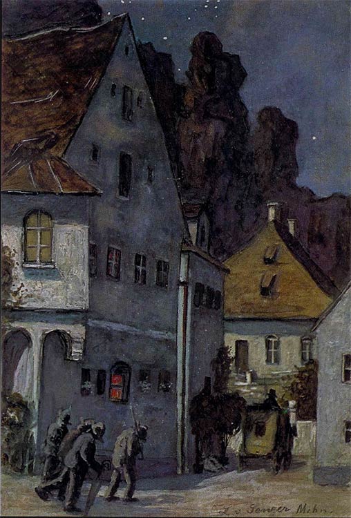 Das nächtliche Stadtbild zeigt den Marktplatz von Kallmünz unter einem dunklen, von Sternen erhellten Himmel. Vor der "goldenen Gans" wanken ein paar Männer (Soldaten?) mit Helmen und Werkzeugen oder Gewehren nach Hause. Die Postkutsche fährt weiter durch die Brunngasse nach Burglengenfeld. Das schwache Licht aus den Fenstern und die dunklen Felsen im Hintergrund verleihen der Szene eine geheimnisvolle, fast dramatische Stimmung.