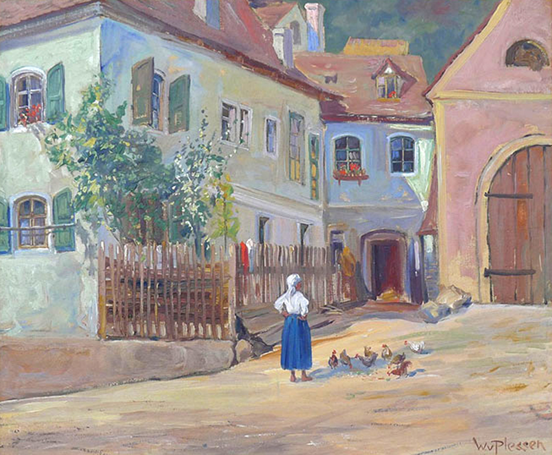Wir gehen weiter Richtung Brunngasse. Das frühere Gebäude von Schuhhaus Schäfer steht ebenfalls seit längerem leer. Der Berliner Maler Willhelm von Plessen (1868 - 1937) hat hier ein ländliche Idylle gesehen. Die Frau mit weißem Koptuch, weißer Bluse und blauem Rock hat wohl gerade ihre Hühner gefüttert. Die Szene mit alten Häusern mit grünen Fensterläden, Blumenkästen und einem Holzzaun spiegeltmit den liebevollen Details eine ruhige, heitere Alltagsdarstellung aus dem ländlichen Leben. Genau das, was die Künstler so angezogen hat. Ein Mitbürger hatte das Bild in einem Antiquariat in München entdeckt und wieder zurück gebracht.