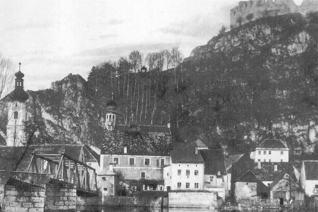 Foto: Bergverein Kallmünz e.V., 1912 Auf unserem Weg rechts auf dem Brückengeländer grüßen wir den heiligen Nepomuk mit den beiden Engeln. Die Inschrift auf deren Tafeln lautete einmal: „St. Nepomuk auf dieser Bruck, nimm Kallmünz in deine Hut.“ Die Rundungen auf dem Geländer verweisen noch auf den alten Turm an dieser Stelle.