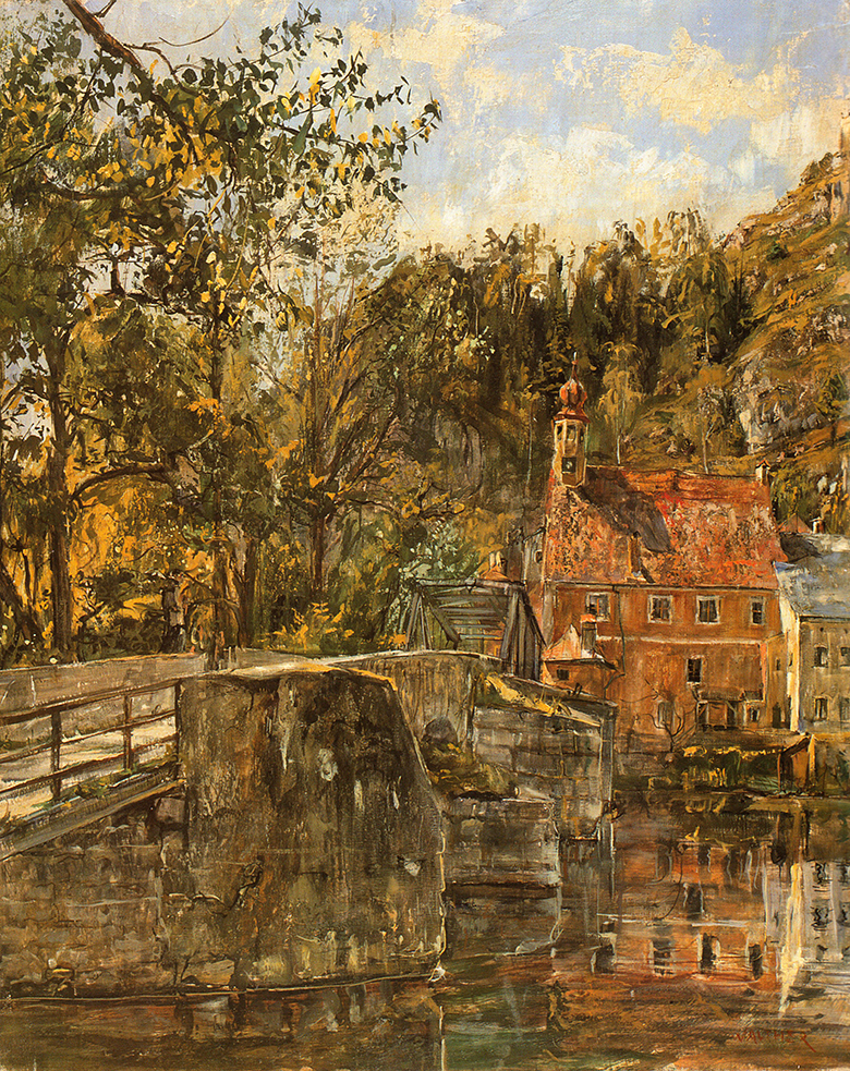 Das Gemälde zeigt die Naabbrücke und das Alte Rathaus von Kallmünz. Die warmen, erdigen Farbtöne und die fein abgestimmten Lichtreflexe auf dem Wasser sind typisch für Walthers Malstil. Sie vermitteln eine fast meditative Ruhe und zeugen von der tiefen Verbundenheit des Künstlers mit seiner Umgebung.