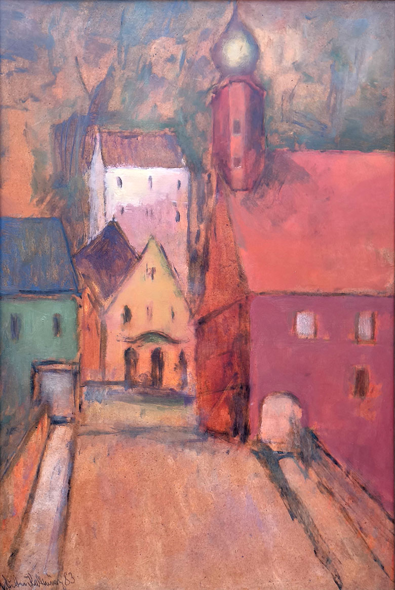 Max Huber wurde 1920 in Hauzenberg geboren und starb 1987 in Deggendorf. In dem Bild " Kallmünz“ fängt er die besondere Atmosphäre des oberpfälzischen Kleinods in einer stillen, beinahe zeitentrückten Stimmung ein. Die klare architektonische Gliederung der Gebäude verbindet sich mit einer weichen, harmonischen Farbigkeit aus warmen Rot-, Gelb- und Blautönen. Der pastose Farbauftrag und die subtile Lichtführung verleihen der Komposition eine poetische Tiefe, die zwischen Realismus und malerischer Abstraktion schwebt. Nach dem Abitur 1939 leistete Max Huber Wehrdienst und kam russische Kriegsgefangenschaft. Ab 1949 entwickelte er eine eigenständige Bildsprache, die sich durch feine Farbnuancen und eine meditative Ruhe auszeichnet. Seit 1955 war er Mitglied des BBK Niederbayern/Oberpfalz, der Münchner Künstlergenossenschaft (kgl. priv. von 1868) sowie der Deggendorfer Künstlergruppe, deren erster Vorsitzender er bis zu seinem Tod blieb.