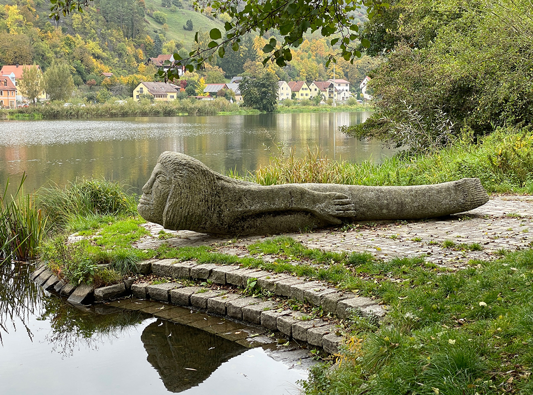 Hier am Ufer der Naab liegt die „Nixe“ – halb Frau, halb Fisch.