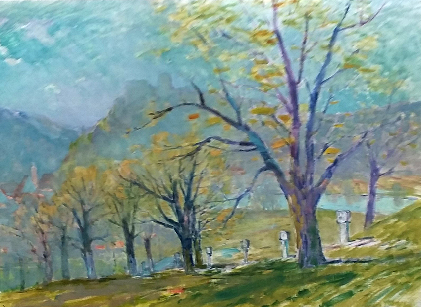 Der Maler Hanns Neudecker (1906 - 1973) kam wie viele Maler aus Regensburg immer wieder nach Kallmünz. Gerade Künstler haben ein Faible für diesen schönen Ausflugsort. Das Fahrrad war das Verkehrsmittel der Nachkriegszeit. Er malt Anfang 1950 den Kreuzweg im Vordergrund mit Blick Kallmünz.
