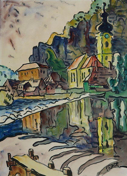 Das Aquarell von Schmdit-Rottluff zeigt eine expressive, farbintensive Ansicht der Flusslandschaft mit der Kirche St. Michael von Kallmünz. Kräftige schwarze Konturlinien fassen die Formen von Gebäuden, Felsen und Vegetation ein. Die Kirche mit ihrem dunklen Zwiebelturm steht markant am rechten Bildrand, vor steil aufragenden Felsen in vibrierenden Blau-, Grün- und Gelbtönen. Der Fluss im Vordergrund spiegelt die Gebäude und Felsen in lebendig verzerrten, rhythmischen Farbflächen. Die Darstellung wirkt dynamisch, spontane Pinselzüge und vereinfachte Formen prägen den expressionistischen Charakter.