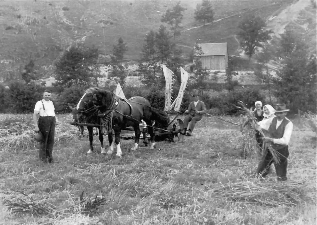 Die Familie Felix Weigert posiert hier auf dem Feld auf der westlichen Vilsseite bei der Getreideernte . Im Hintergrund der Aufgang zur Burg von der Vilsgasse aus. Die Mähmaschine ist ein Beispiel für den geschichtlichen Übergang zwischen landwirtschaftlicher Handarbeit und komplett maschinengesteuerter Ernte: Durch die Verwendung der Maschine, ein Selbstabler, wurde nur noch eine Person für das Mähen großer Flächen benötigt, die Ernte wurde somit um ein Vielfaches vereinfacht und beschleunigt. Trotzdem waren anschließend weitere manuelle Schritte nötig, um das Getreide zu Korn und Stroh weiterzuverarbeiten. Gezogen wurde die Maschine von zwei Pferden (andere Bauern hatten nur Ochsen dafür zur Verfügung) und alle mechanischen Teile wurden über die schweren Eisenräder angetrieben. Für die Getreideernte ist der rotierende hölzerne Ableger besonders hilfreich: Er zerteilt das durch den Mähbalken geschnittene Getreide in gleichmäßige Haufen und legt diese hinter der Maschine auf dem Acker ab. Dies erleichtert den nächsten Arbeitsschritt: das Bündeln der geschnittenen Halme zu Garben, die dann zum Trocknen in Getreidemandeln aufgestellt wurden. Im Winter hatte man dann Zeit das getrocknete Korn aus den Ähren zu dreschen.