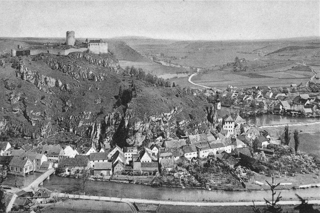 Der Weizenberg ist heute bewaldet, so dass keine Aussicht auf Kallmünz mehr möglich ist. Blick auf Kallmünz von der alten Dinauer Straße auf die Burgruine.