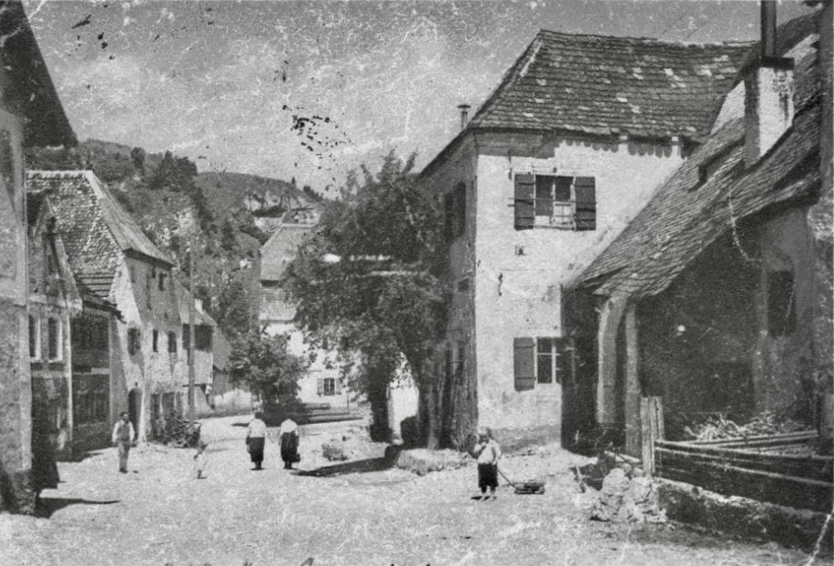 Bäuerliche Häuser mit Schindeldächern und Holzläden, der Misthaufen vor dem Haus sorgt für einen ländlichen Duft. Die Frauen in Schürzen gehen zur Bäckerei Plank zum Einkaufen, der Mann kommt gerade vom Wagner-Wirt. Die Kinder spielen unbehindert vom Verkehr auf der staubigen Gasse. Das Haus vom Zengerbeck mit dem prächtigen Obstbaum musste mittlerweile einem Neubau weichen