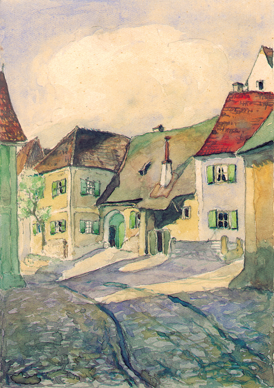 In dieser Darstellung zeigt Hans Lassleben den Gänsbügel, eine typische Straßenszene des alten Kallmünz. Mit fließender Aquarelltechnik und leuchtender Farbigkeit fängt er das Spiel von Licht und Schatten auf den unregelmäßigen Hausfassaden und dem Kopfsteinpflaster ein. Die leichte Vereinfachung der Formen und die klare, helle Farbigkeit verleihen dem Werk eine heitere, beinahe lyrische Spannung.
