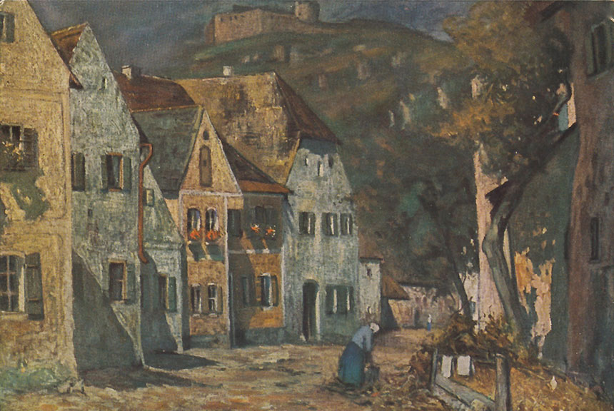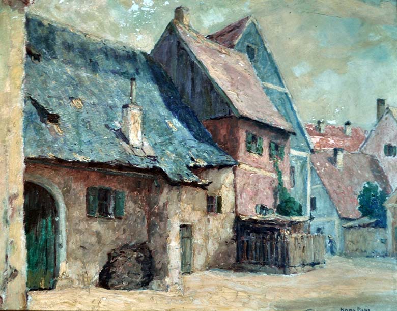 Hans Licht malt die Alte Regensburger Straße mit den charakteristischen schiefen Dächern und verwitterten Fassaden des sogenannten Gänsbügels. Er gestaltet die Szene mit kräftigem, pastosem Farbauftrag und feinem Gespür für Licht und Atmosphäre. Der warme Ton der Mauern und das gebrochene Blau der Dächer verleihen der Darstellung eine stille, beinahe intime Stimmung.