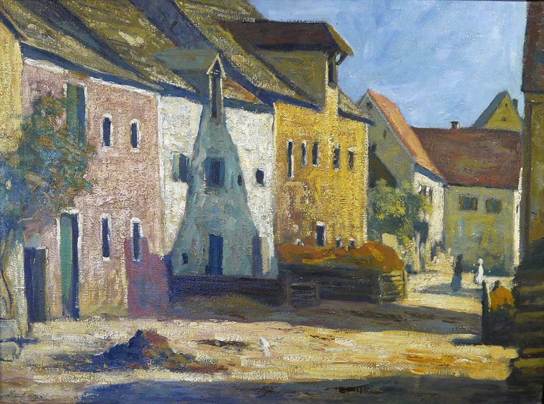 Ludwig von Senger fängt das gedämpfte Nachmittagslicht ein, das die Fassaden in kühlen Blau- und Ockertönen leuchten lässt. In der ruhigen Komposition und dem feinen Wechsel von Licht und Schatten zeigt sich seine Nähe zur Münchner Schule und zum Spätimpressionismus.