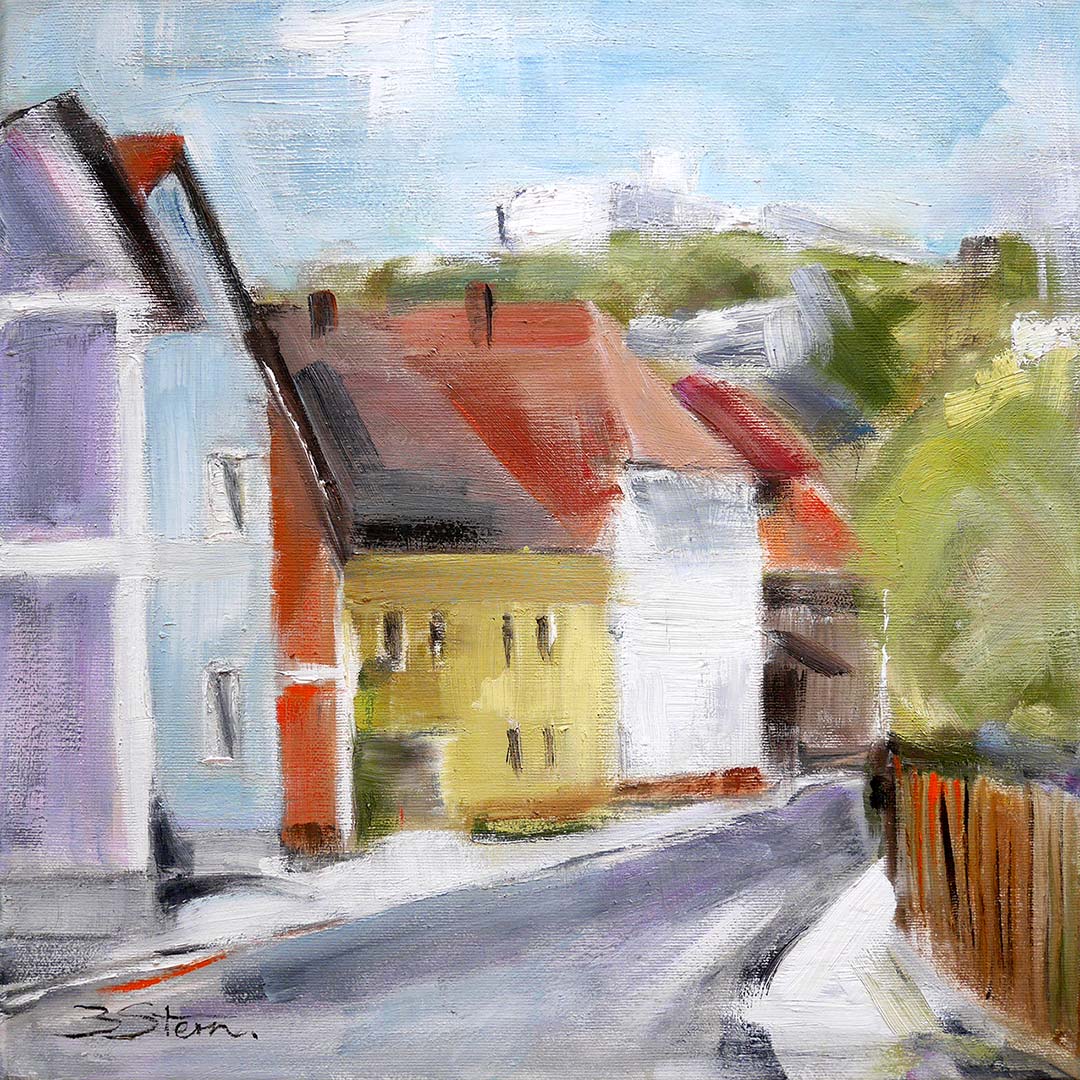 Auch die Deggendorfer Künstlerin Birgit Stern (geboren 1970) widmet sich in diesem Gemälde der Regensburger Straße in Kallmünz, In lockerem, expressivem Pinselduktus und mit klaren, leuchtenden Farbflächen reduziert sie die Ansicht auf wesentliche Formen und Stimmungen. Der pastose Farbauftrag und die rhythmische Komposition verleihen der Szene eine moderne, fast abstrahierende Wirkung, ohne den Bezug zum realen Ort aufzugeben.