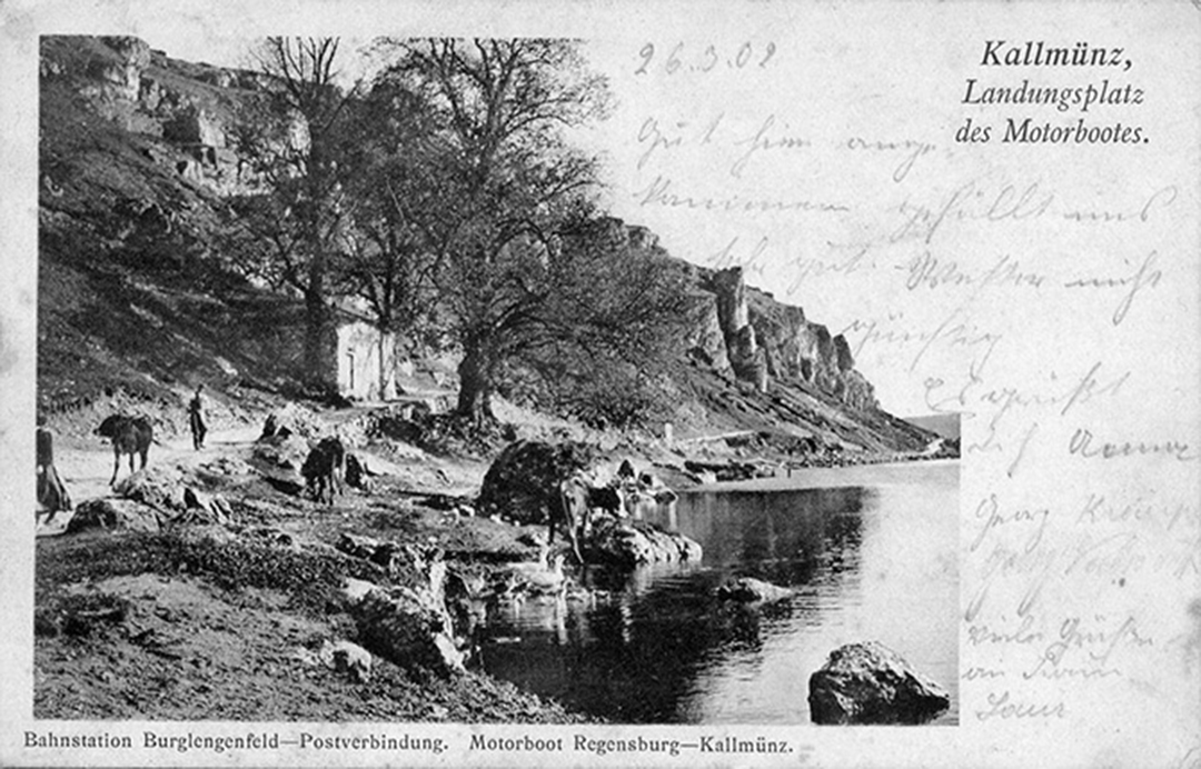 Bergverein Kallmünz, Kallmünz, Ländeplatz, Postkarte 1901Reisen in früheren Zeiten war nach unseren Maßstäben heute einigermaßen beschwerlich. Kallmünz konnte man Anfang des 20. Jahrhunderts über den Bahnhof Burglengenfeld erreichen, den Rest musste man zu Fuß gehen (so wie Erna und Josef Georg Miller noch 1944).