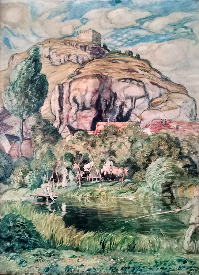 Georg Mayer-Franken (1870 - 1826) hat seine Ansicht von Kallmünz eher in hellen Tönen gehalten. Sie zeigt im Vordergrund die Vils mit einem Angler, der nur halb im Bild ist. Auf dem Steg an der Vils läßt eine Mutter ihr Kind im Wasser plantschen. Eine junge blonde Frau, die vom Ufer aus zusieht spiegelt sich im Wasser der Vils. Unter den Bäumen sitzen Menschen auf einer Bank ins Gespräch vertieft. Die ländliche Idylle wird überragt von dem Felsmassiv des Schloßberges. Darüber thront perspektivisch überhöht die Burgruine.
