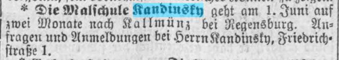Eine kleine Anzeige in den Münchener neuesten Nachrichten warb am 27. Mai 1903 für die Malschule Kandinsky in Kallmünz.