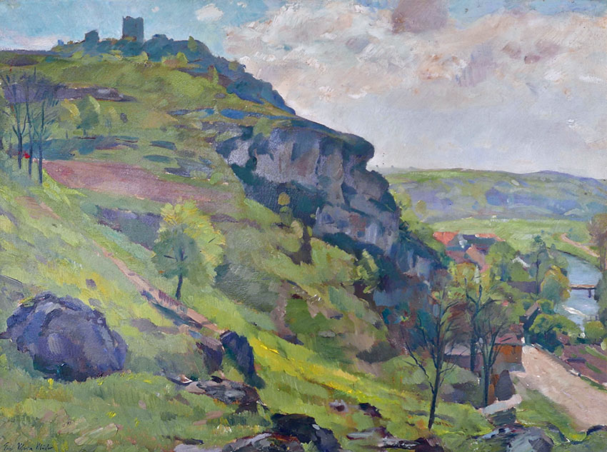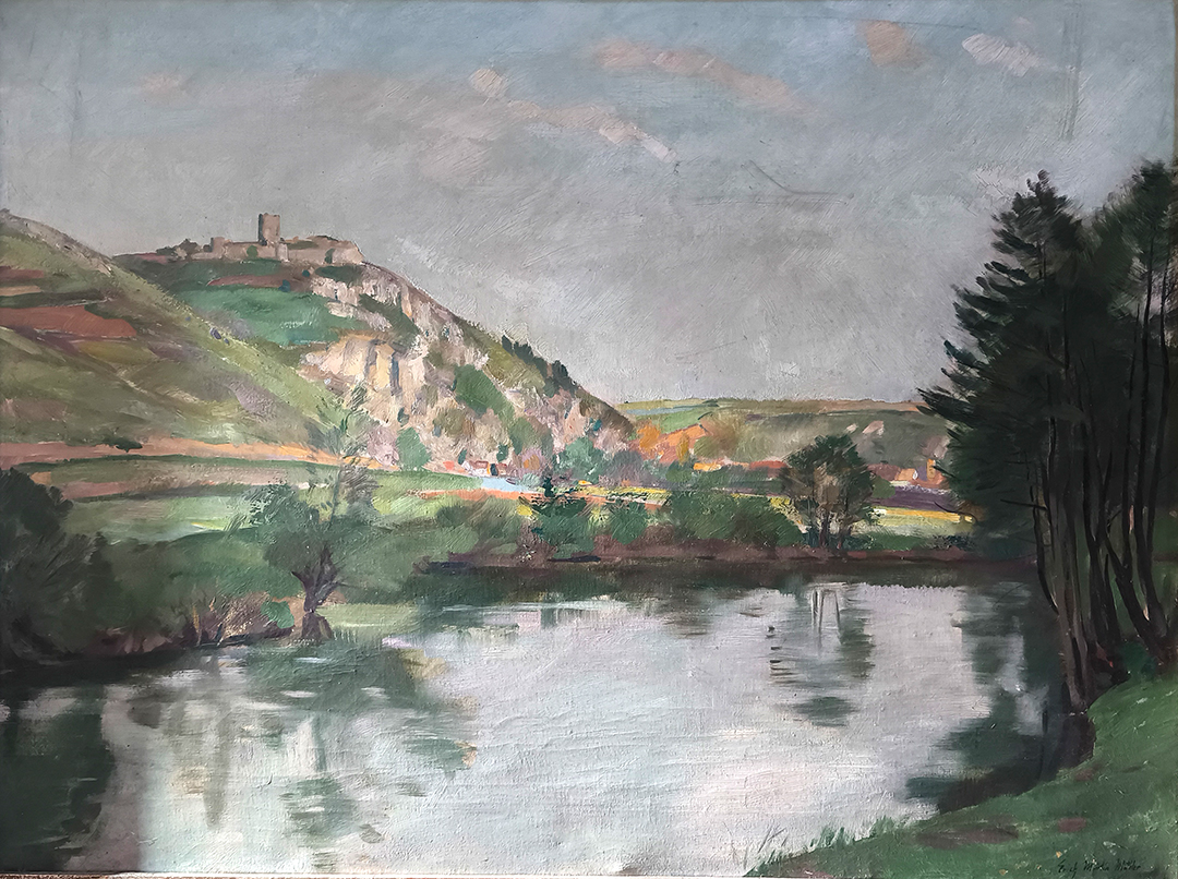 Erich Martin Müller (1888 - 1972) zeigt in seinem Gemälde den Blick über das Vilstal hinauf zur Burgruine Kallmünz. Das frische Grün der Hänge, das klare Licht und die fließenden Übergänge der Farben verleihen der Szene eine atmosphärische Leichtigkeit. Mit lockerer, doch präziser Pinselführung und harmonischer Farbigkeit schafft Müller eine Komposition von großer Ruhe und Weite.