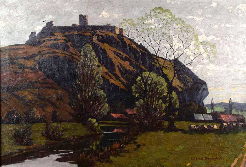 Dieses großformatige Frühlingsbild von Alfred Streubel (1861 - 1947) zeigt die Burgruine von der Vilsseite in frühlingshafter Stimmung. Es wurde auf einer Auktion in Chemnitz angeboten und nach Kallmünz zurückgebracht.