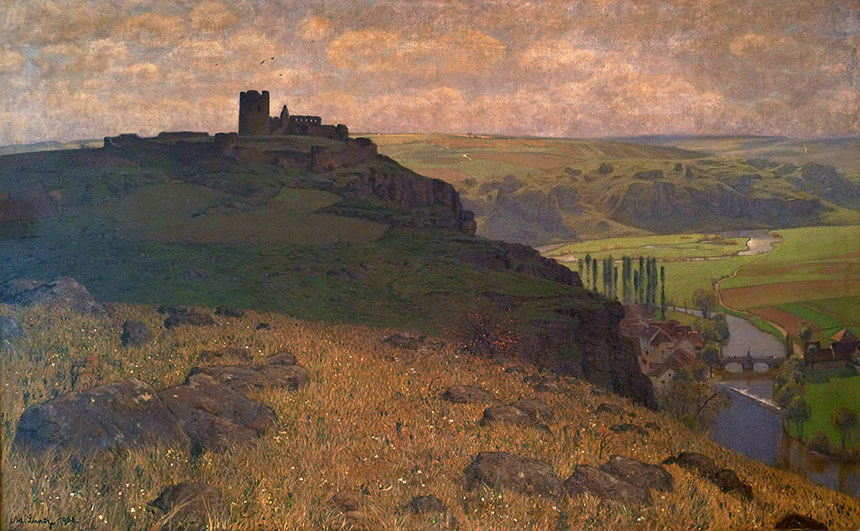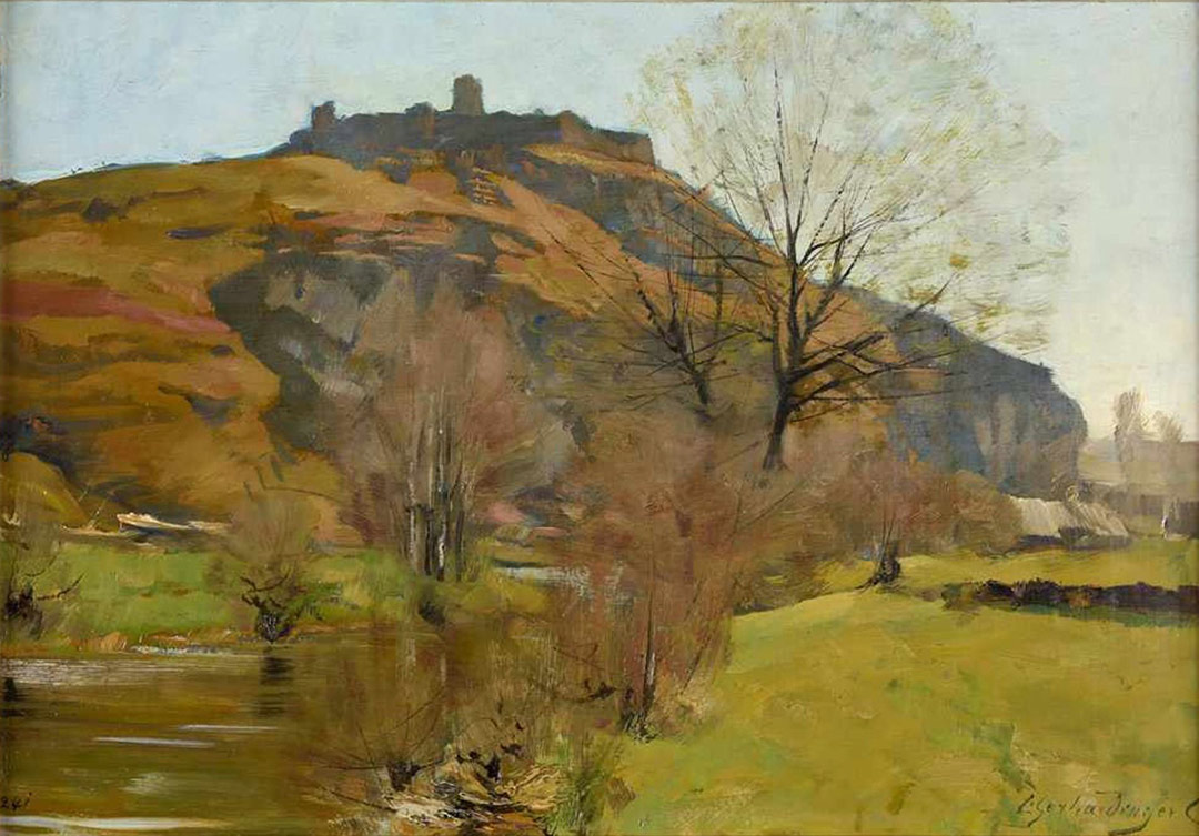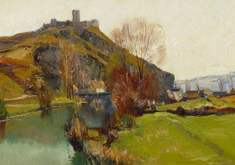 Auf dem Bild von Adolf Luntz (1875 - 1925), Kunstprofessor aus Karlsruhe, erhebt sich die Ruine der Burg Kallmünz, dunkel und massiv gegen den weiten Himmel als Silhouettiere ab. Der Blick gleitet hinunter ins grüne Tal, wo sich der Fluss in eleganten Windungen durch die Wiesen zieht und eine kleine Brücke sowie einige Häuser das ländliche Leben andeuten. Stilistisch ist das Werk von einer ruhigen, klar gegliederten Komposition geprägt, die auf Ausgewogenheit und Harmonie zielt. Die Formen sind präzise modelliert, ohne kleinteilige Detailmalerei, und die Flächen erscheinen beinahe stilisiert, was der Landschaft etwas Monumentales und Zeitloses verleiht. Die Farbgebung ist zurückhaltend und warm – Ocker, Grün, Braun und gedeckte Blautöne dominieren –, während das Licht gleichmäßig über die Szenerie verteilt ist. Dadurch entsteht keine dramatische, sondern eine stimmungsvolle, fast meditative Atmosphäre. Der Künstler verzichtet auf impressionistische Flüchtigkeit oder spontane Pinselstriche; stattdessen zeigt er eine bewusste, konstruktive Formauffassung, die an die Stimmungslandschaften des späten 19. und frühen 20. Jahrhunderts erinnert. In der Verbindung von realer Topografie und idealisierender Gestaltung liegt eine Nähe zum Symbolismus und Jugendstil, wie man sie etwa bei Malern der Münchner Schule oder Wiener Secession findet.