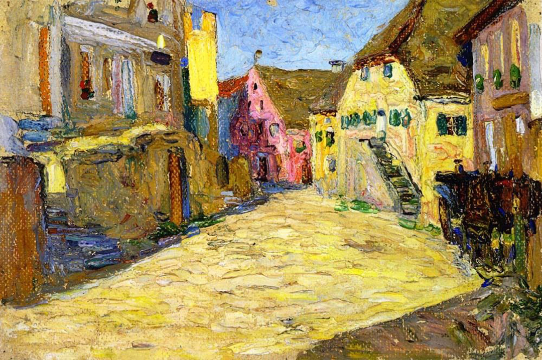 Das Gemälde zeigt die Vilsgasse in Kallmünz in kräftigen, leuchtenden Farben, mit einer dichten, pastosen Malweise und betonter Struktur. Kandinsky fängt die südlich-warme Lichtstimmung des bayerischen Ortes ein und verwandelt sie in ein vibrierendes Farbspiel. Die Komposition führt den Blick entlang der Häuserzeile nach hinten, wo sich die Straße leicht krümmt. Der Farbauftrag ist energisch, die Konturen beginnen sich im Licht aufzulösen – ein frühes Anzeichen seiner Suche nach malerischer Autonomie der Farbe.
