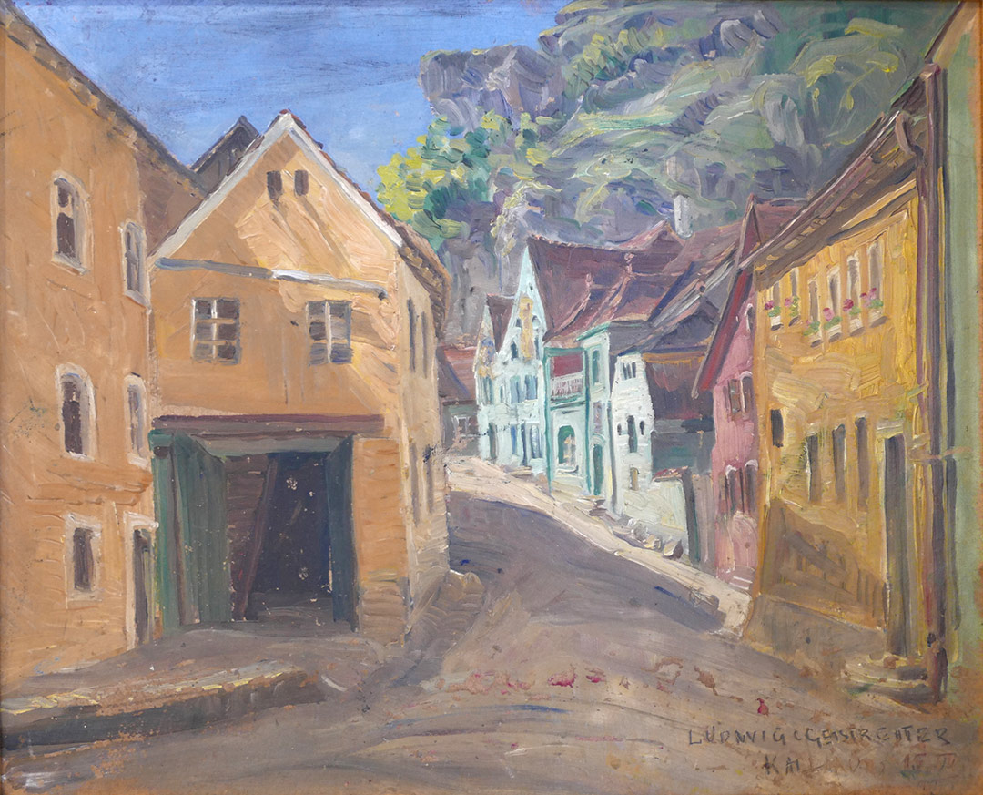 In diesem kleinen Gemälde zeigt er die Vilsgasse in Kallmünz mit ihren charakteristischen Giebelhäusern, überragt vom steilen Felsen. Im Mittelpunkt steht das markante, hellgrüne Gebäude der „Roten Amsel“. Mit schnellem Pinselstrich und kräftigen, warmen Farbtönen gestaltet Geistreiter eine lebendige, rhythmisch aufgebaute Straßenszene. Ludwig Geistreiter war ein begeisterterLandschaftsmaler. Seine Motive fand er in den Alpen und im Raum Regensburg natürlich in Kallmünz. Die meisten Bilder und Studien wurden beim Bombenangriff auf die in Regensburg am 17.August 1943 zerstört. Der hier gezeigten Arbeit sieht man noch die Kriegsschäden an.
