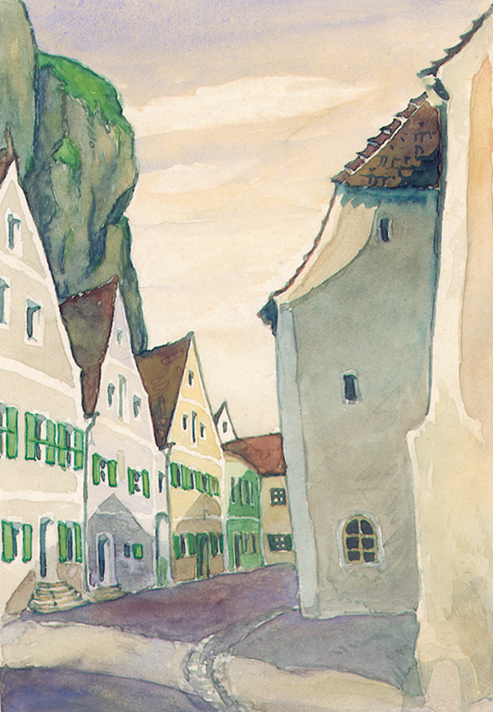 Das Aquarell zeigt die enge Vilsgasse in Kallmünz mit ihren giebelständigen Bürgerhäusern, die sich malerisch an den Felsen des Vilsufers schmiegen. In zarten, fein abgestimmten Farbtönen und klarer Linienführung gestaltet Hans Lassleben eine ruhige, harmonische Ansicht des historischen Ortskerns. Die transparente Farbgebung und die sanfte Lichtstimmung verleihen der Szene eine heitere, beinahe poetische Atmosphäre.