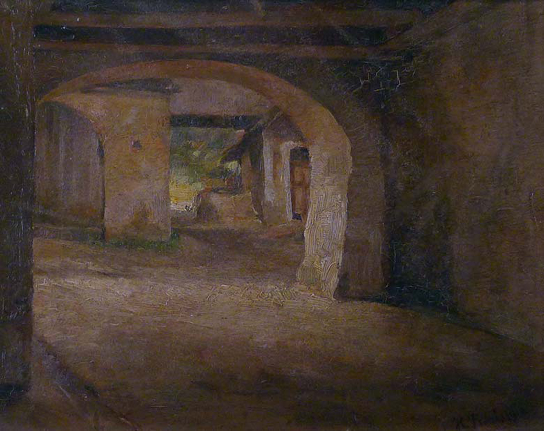 Dieses Ansicht von ihm ist eine absolute Seltenheit. Er hat in Kallmünz nicht die große Landschaft gemalt, das Brunntor, die schmucken Häuser oder die Naabbrücke, wie seine Malerkollegen. Ihn interessiert die düstere Durchfahrt von der Vilsgasse durch den Gasthof zur Post, das Bayerl Anwesen.