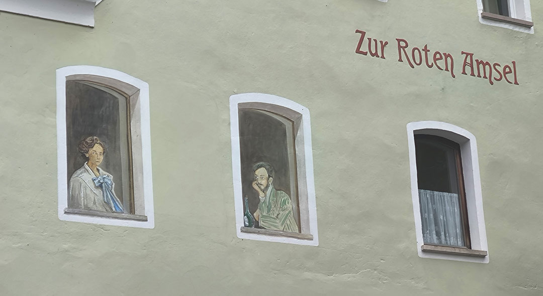 Münter fürchtete jetzt einen frustrierten Kandinsky anzutreffen. Doch der erschien wohlgelaunt und begleitete sie zur Unterkunft in der "Roten Amsel", wo auch die anderen Teilnehmer der Malschule Phalanx untergebracht waren, mit Ausnahme von dem Schweden Carl Palme, der beim Töpfer Glötzl wohnte.